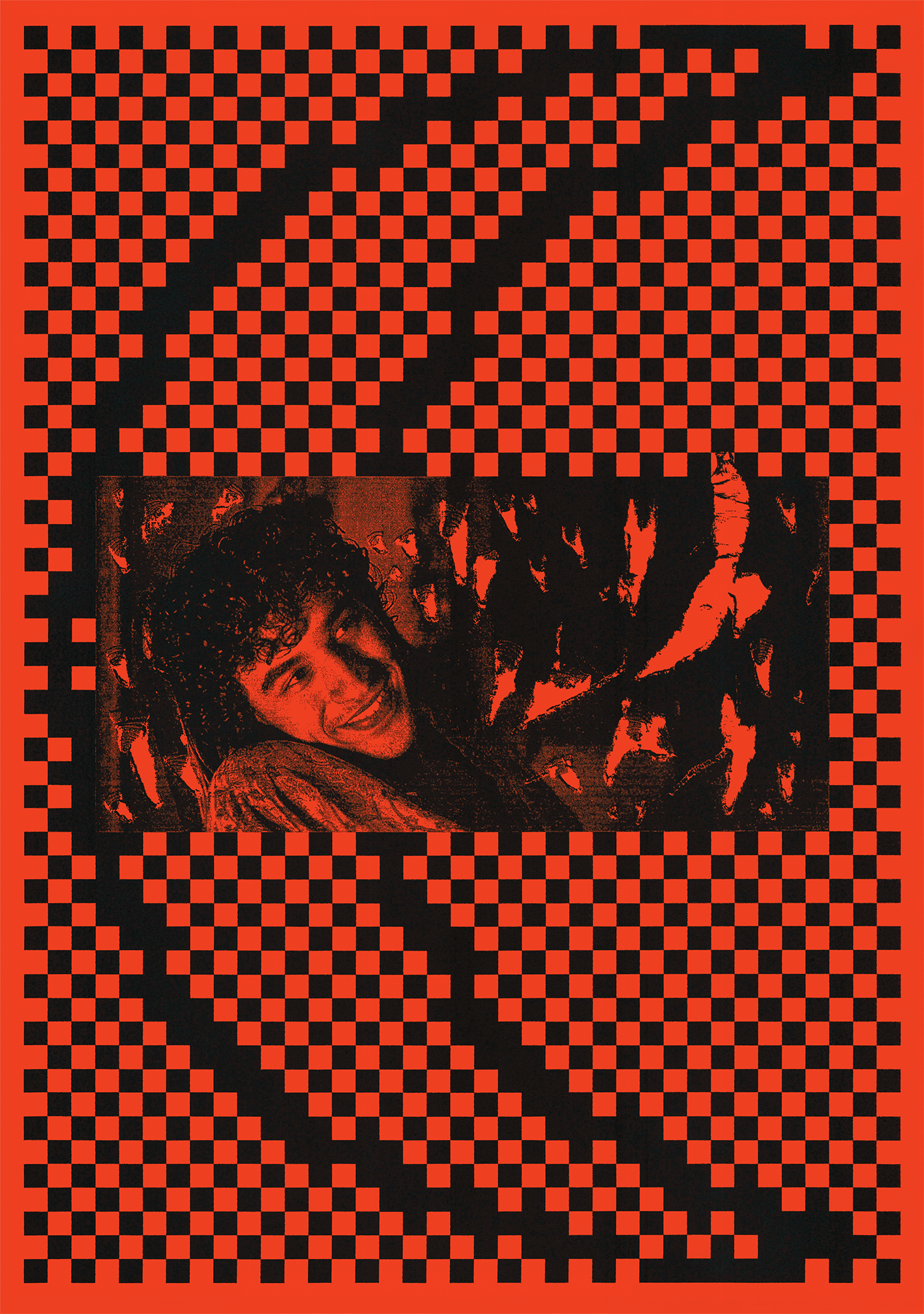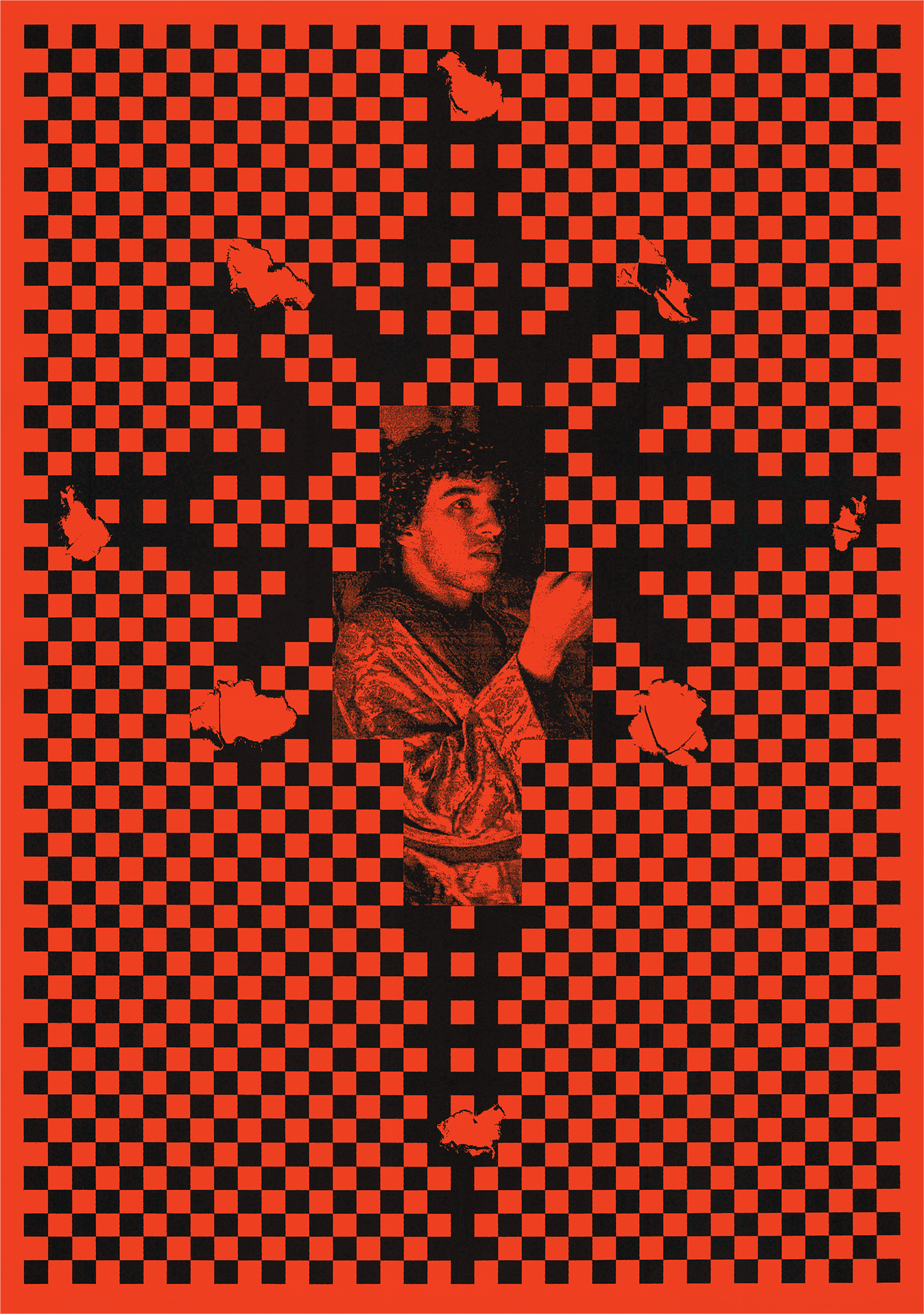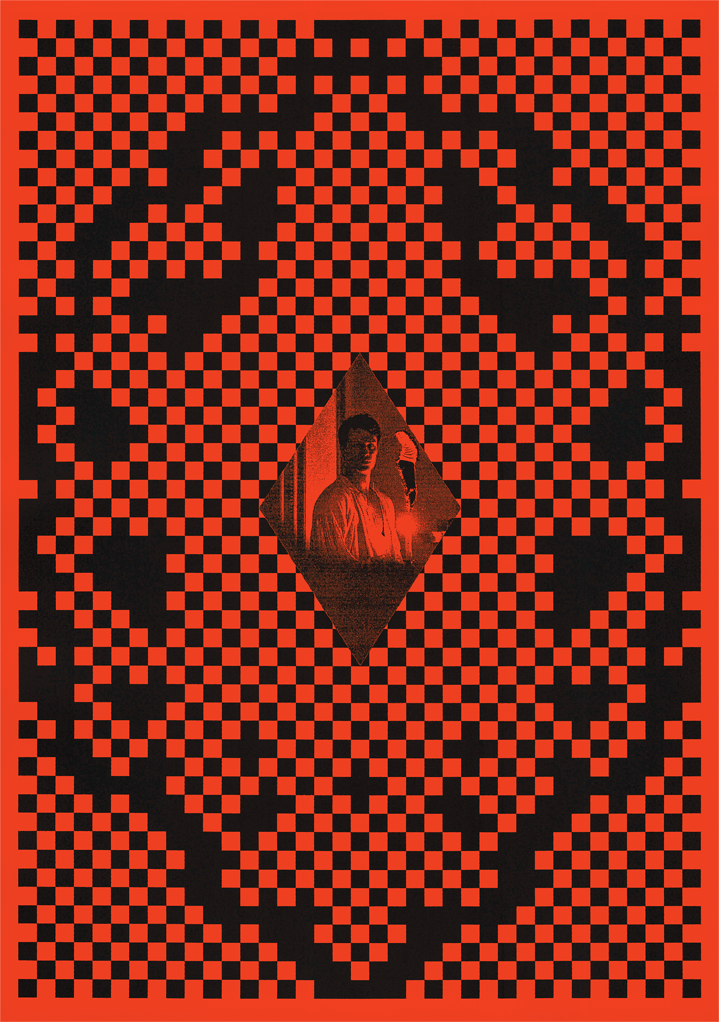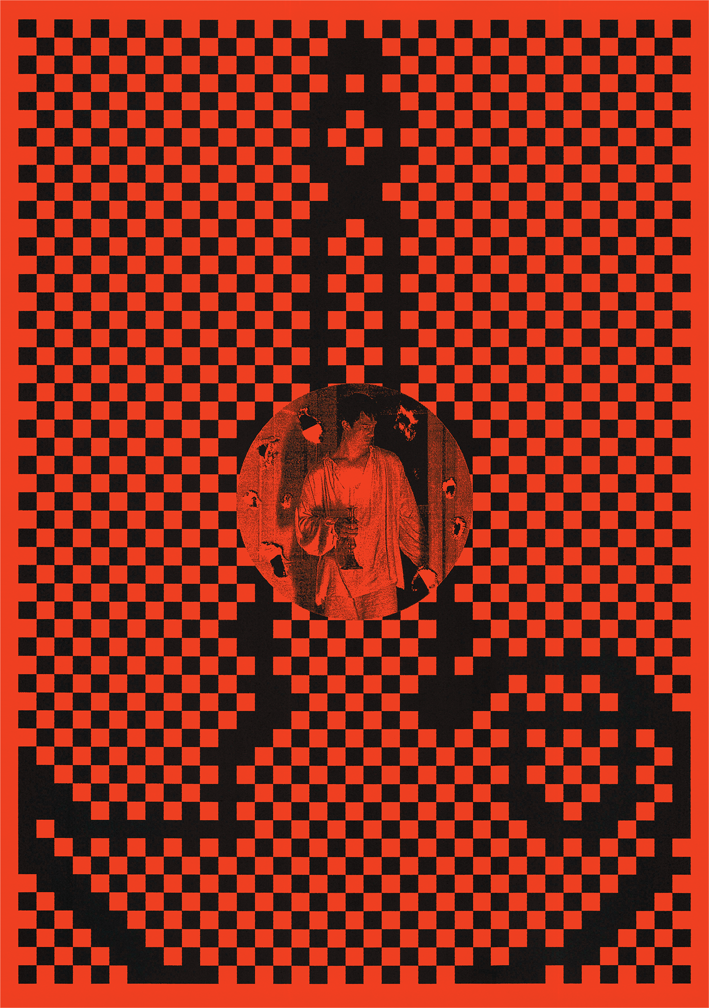 The series of prints An Allure So Foreign Yet So Central, named after a slightly modified quote from American gay novelist Edmund White, is a deep dive into George’s first encounter with fluid sexuality. As through the flickering light of a candle, these five orange-tainted designs portray both characters, Galitzine’s George and Gharbia’s Jean, as they flirt with each other on the eve of their first night together.